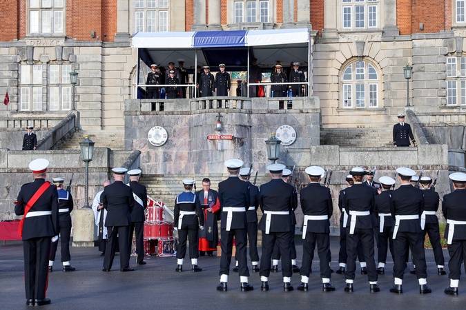 King Charles III, The Lord High Admiral (C) and Captain Andrew Bray (L) preside over the Lord High Admiral's Parade at Britannia Royal Naval College on December 19, 2025 in Dartmouth, England. King Charles III, The Lord High Admiral, presides over the Lord High Admiral's Divisions at Britannia Royal Naval College (BRNC), where he oversees the blessing of the King's new colours and inspects the front ranks, Credit:Avalon.red / Avalon