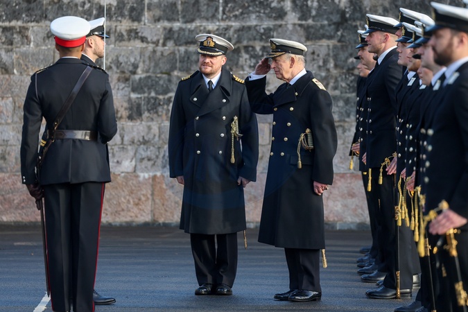 King Charles III, The Lord High Admiral, inspects the Guard at Britannia Royal Naval College accompanied by Captain Andrew Bray (L) on December 19, 2025 in Dartmouth, England. King Charles III, The Lord High Admiral, presides over the Lord High Admiral's Divisions at Britannia Royal Naval College (BRNC), where he oversees the blessing of the King's new colours and inspects the front ranks, Credit:Avalon.red / Avalon