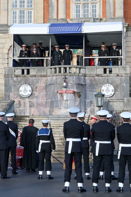 King Charles III, The Lord High Admiral (C) and Captain Andrew Bray (L) preside over the Lord High Admiral's Parade in front of Royal Navy Cadets standing at attention at Britannia Royal Naval College on December 19, 2025 in Dartmouth, England. King Charles III, The Lord High Admiral, presides over the Lord High Admiral's Divisions at Britannia Royal Naval College (BRNC), where he oversees the blessing of the King's new colours and inspects the front ranks, Credit:Avalon.red / Avalon