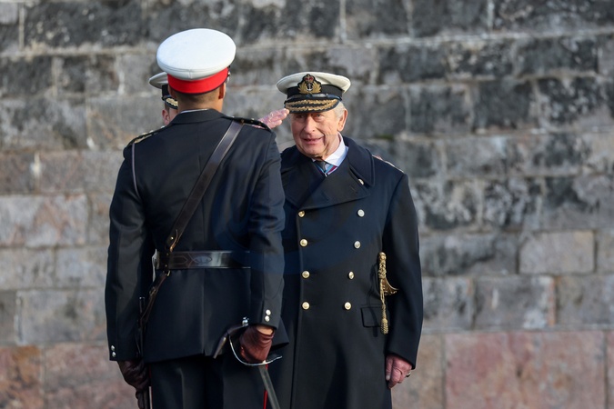 King Charles III, The Lord High Admiral, salutes during a visit to The Lord High Admiral's Divisions at Britannia Royal Naval College on December 19, 2025 in Dartmouth, England. King Charles III, The Lord High Admiral, presides over the Lord High Admiral's Divisions at Britannia Royal Naval College (BRNC), where he oversees the blessing of the King's new colours and inspects the front ranks, Credit:Avalon.red / Avalon
