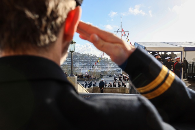 A newly commissioned Naval Officers salutes during the Lord High Admiral's Divisions at Britannia Royal Naval College on December 19, 2025 in Dartmouth, England. King Charles III, The Lord High Admiral, presides over the Lord High Admiral's Divisions at Britannia Royal Naval College (BRNC), where he oversees the blessing of the King's new colours and inspects the front ranks., Credit:Avalon.red / Avalon