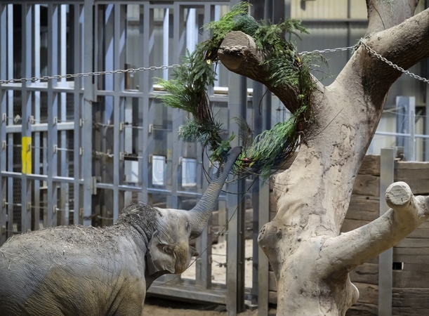 Animals receive Christmas gifts at Whipsnade ZooNang Phaya the Asian elephant calf investigating a Christmas wreath made from willow and conifer.Picture date: Thursday December 11, 2025., Credit:Anthony Devlin / Avalon