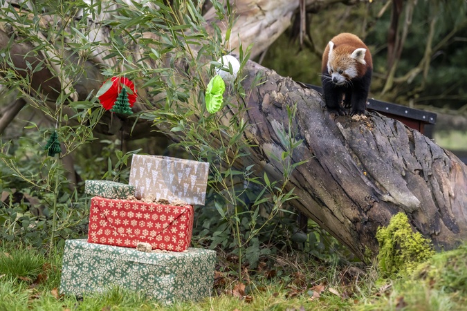 Animals receive Christmas gifts at Whipsnade ZooRuby the red panda marvels at her food-filled Christmas presents.Picture date: Thursday December 11, 2025., Credit:Anthony Devlin / Avalon