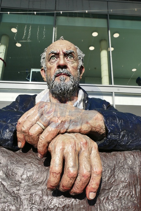 Sculptures at The ‘Who Am I?' Exhition at The Said School. This major exhibition brings together sculptures by celebrated British artist Sean Henry within the striking Saïd Business School in Oxford. Created between 2001 and 2024, these figurative works are installed throughout the School's lobby and Romanesque corridors, culminating in the monumental Seated Figure a three-metre-high bronze that looks out onto the city from the School's public courtyard.The exhibition invites visitors to reflect on themes of identity, perception, and connection. Henry's polychrome sculptures, painted in naturalistic tones, feel at once familiar and enigmatic. Through their scale, posture, and expression, they prompt questions about who we are, how we see others, and how art can reframe our sense of self within public space., Credit:Geoffrey Swaine / Avalon