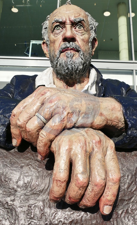 Sculptures at The ‘Who Am I?' Exhition at The Said School. This major exhibition brings together sculptures by celebrated British artist Sean Henry within the striking Saïd Business School in Oxford. Created between 2001 and 2024, these figurative works are installed throughout the School's lobby and Romanesque corridors, culminating in the monumental Seated Figure a three-metre-high bronze that looks out onto the city from the School's public courtyard.The exhibition invites visitors to reflect on themes of identity, perception, and connection. Henry's polychrome sculptures, painted in naturalistic tones, feel at once familiar and enigmatic. Through their scale, posture, and expression, they prompt questions about who we are, how we see others, and how art can reframe our sense of self within public space., Credit:Geoffrey Swaine / Avalon