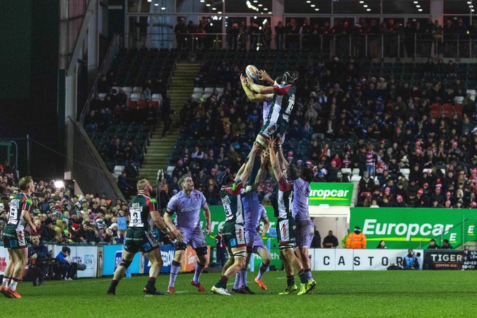 Harry Wells of Leicester Tigers wins a lineout during the Gallagher Premiership match Leicester Tigers vs Gloucester Rugby at Mattioli Woods Welford Road Stadium, Leicester, United Kingdom, 19th December 2025, Credit:Craig Evans/News Images / Avalon