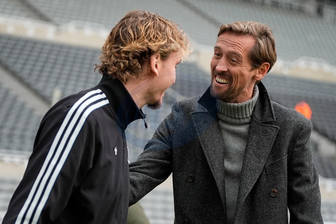 Peter Crouch and Nick Woltemade of Newcastle United share a light moment during the Premier League match Newcastle United vs Chelsea at St. James's Park, Newcastle, United Kingdom, 20th December 2025, Credit:Maynard Manyowa/News Images / Avalon