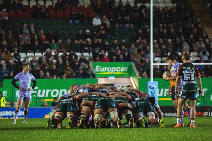 Both teams scrum on the half way line during the Gallagher Premiership match Leicester Tigers vs Gloucester Rugby at Mattioli Woods Welford Road Stadium, Leicester, United Kingdom, 19th December 2025, Credit:Craig Evans/News Images / Avalon