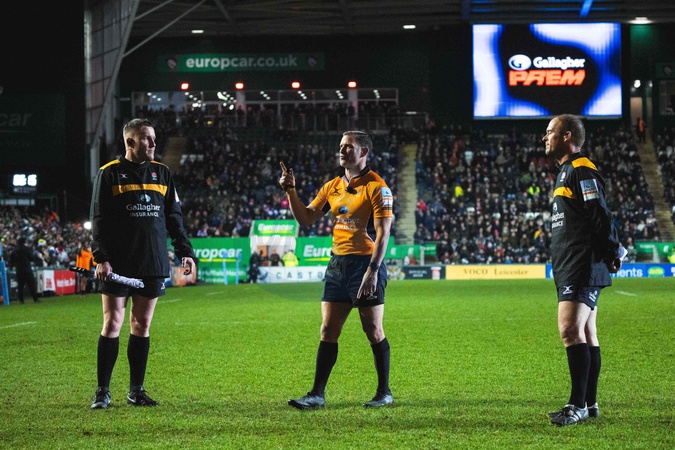 Karl Dickinson and his refereeing team look at possible foul play on the big screen during the Gallagher Premiership match Leicester Tigers vs Gloucester Rugby at Mattioli Woods Welford Road Stadium, Leicester, United Kingdom, 19th December 2025, Credit:Craig Evans/News Images / Avalon