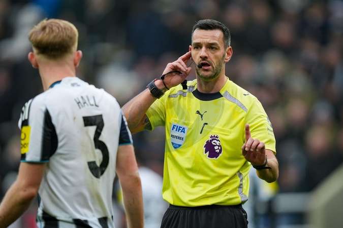 Referee Andy Madley checks for handball during the Premier League match Newcastle United vs Chelsea at St. James's Park, Newcastle, United Kingdom, 20th December 2025, Credit:Maynard Manyowa/News Images / Avalon