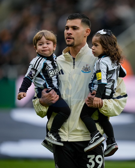 Bruno Guimaraes of Newcastle United with two children at kickoff during the Premier League match Newcastle United vs Chelsea at St. James's Park, Newcastle, United Kingdom, 20th December 2025, Credit:Maynard Manyowa/News Images / Avalon