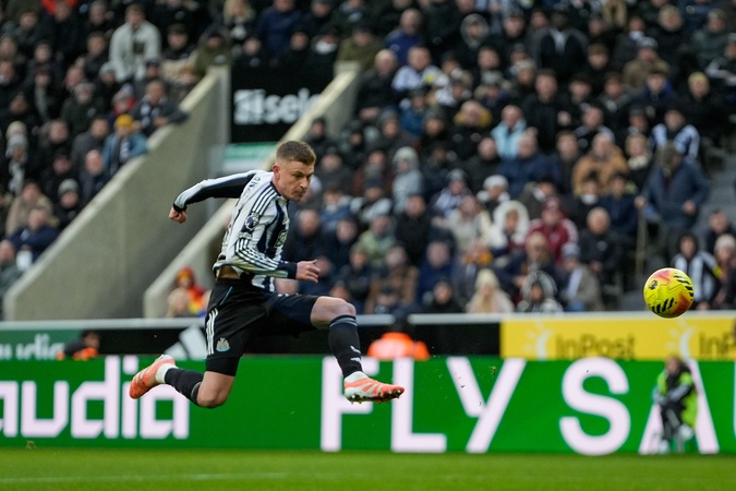 Harvey Barnes of Newcastle United takes a shot during the Premier League match Newcastle United vs Chelsea at St. James's Park, Newcastle, United Kingdom, 20th December 2025, Credit:Maynard Manyowa/News Images / Avalon