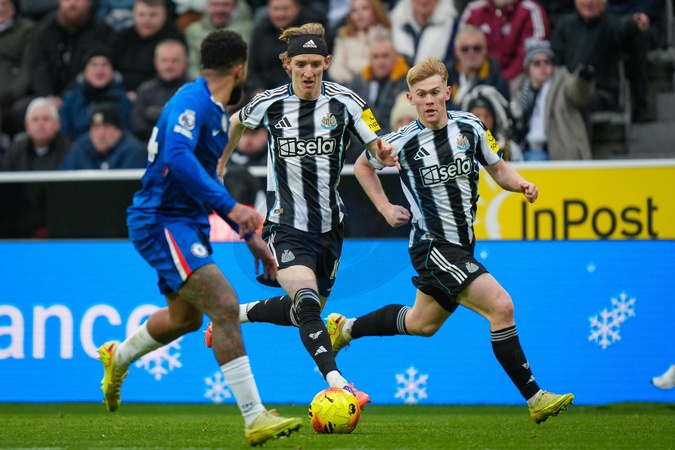 Anthony Gordon of Newcastle United runs with the ball on the wing with Lewis Hall of Newcastle United offering support as ,Reece James marks him during the Premier League match Newcastle United vs Chelsea at St. James's Park, Newcastle, United Kingdom, 20th December 2025, Credit:Maynard Manyowa/News Images / Avalon