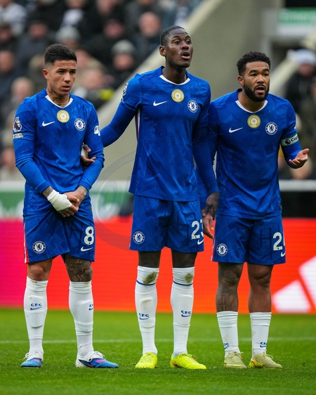 Chelsea players Enzo Fernandez of Chelsea, Trevoh Chalobah of Chelsea and Reece James of Chelsea set up in a wall during the Premier League match Newcastle United vs Chelsea at St. James's Park, Newcastle, United Kingdom, 20th December 2025, Credit:Maynard Manyowa/News Images / Avalon