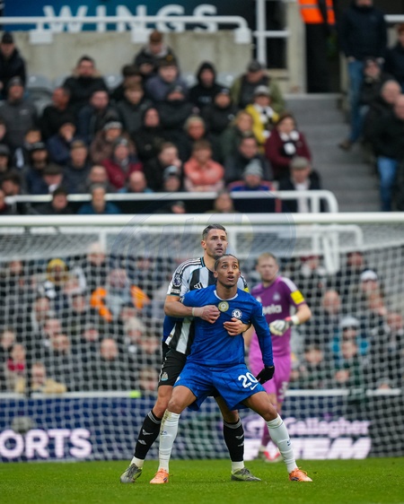Joao Pedro of Chelsea battles for the ball with Fabian Schar of Newcastle United during the Premier League match Newcastle United vs Chelsea at St. James's Park, Newcastle, United Kingdom, 20th December 2025, Credit:Maynard Manyowa/News Images / Avalon