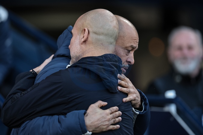 Pep Guardiola manager of Manchester City embraces Nuno Espirito Santo manager of West Ham United during the Premier League match Manchester City vs West Ham United at Etihad Stadium, Manchester, United Kingdom, 20th December 2025, Credit:Mark Cosgrove/News Images / Avalon