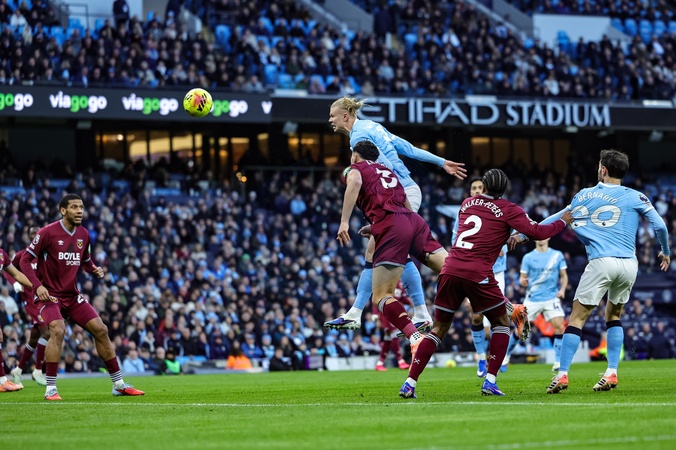 Erling Haaland of Manchester City heads on goal during the Premier League match Manchester City vs West Ham United at Etihad Stadium, Manchester, United Kingdom, 20th December 2025, Credit:Mark Cosgrove/News Images / Avalon