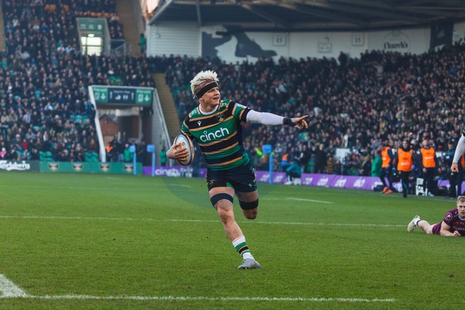 Henry Pollock of Northampton Saints scores the opening try during the Gallagher Premiership match Northampton Saints vs Sale Sharks at Cinch Stadium at Franklin's Gardens, Northampton, United Kingdom, 20th December 2025, Credit:Craig Evans/News Images / Avalon