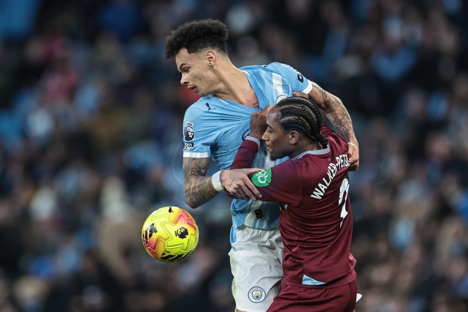Nico O'Reilly of Manchester City and Kyle Walker-Peters of West Ham United battle for the ball during the Premier League match Manchester City vs West Ham United at Etihad Stadium, Manchester, United Kingdom, 20th December 2025, Credit:Mark Cosgrove/News Images / Avalon