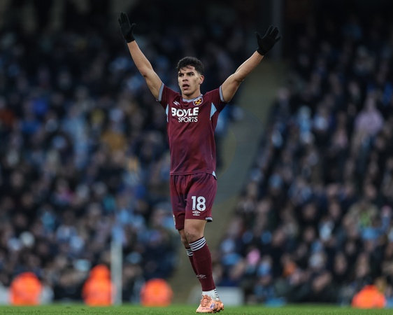 Mateus Fernandes of West Ham United reacts during the Premier League match Manchester City vs West Ham United at Etihad Stadium, Manchester, United Kingdom, 20th December 2025, Credit:Mark Cosgrove/News Images / Avalon