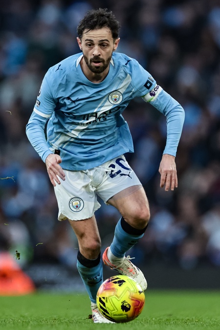 Bernardo Silva of Manchester City breaks with the ball during the Premier League match Manchester City vs West Ham United at Etihad Stadium, Manchester, United Kingdom, 20th December 2025, Credit:Mark Cosgrove/News Images / Avalon