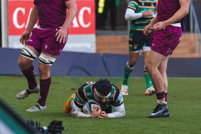 Josh Kemeny of Northampton Saints scores Saints third try during the Gallagher Premiership match Northampton Saints vs Sale Sharks at Cinch Stadium at Franklin's Gardens, Northampton, United Kingdom, 20th December 2025, Credit:Craig Evans/News Images / Avalon