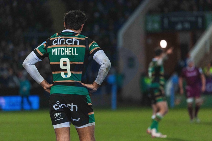 Alex Mitchell of Northampton Saints during the Gallagher Premiership match Northampton Saints vs Sale Sharks at Cinch Stadium at Franklin's Gardens, Northampton, United Kingdom, 20th December 2025, Credit:Craig Evans/News Images / Avalon
