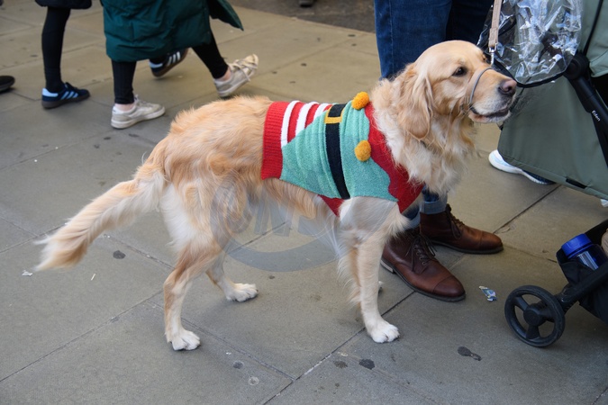 A dog in a Christmas elf outfit on Oxford Street, London, England, UK on Saturday 20 December, 2025 on the last Saturday before Christmas., Credit:Justin Ng / Avalon