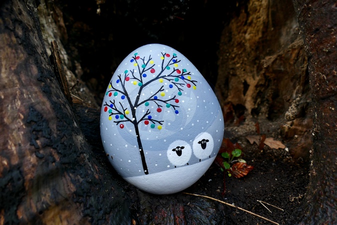 A rock painted with a seasonal scene is left in a tree trunk for a passer by to take., Credit:Geoffrey Swaine / Avalon