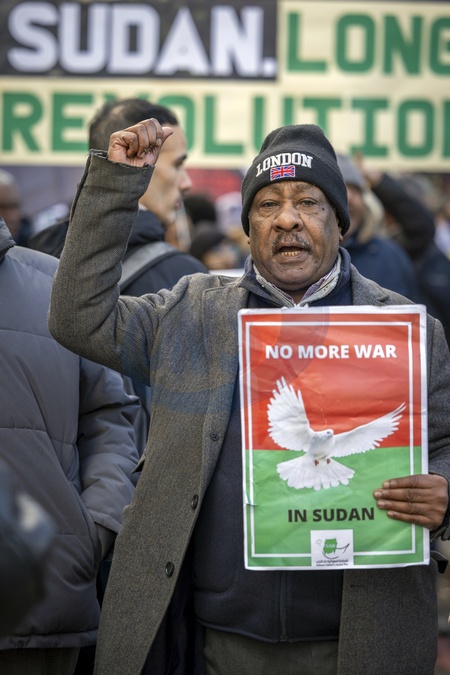 London, UK – On Saturday 20 December 2025, Sudanese communities gathered and marched from Church Street, W2 1EB to Marble Arch to commemorate the 2018 December Revolution. The demonstration honoured the martyrs of the revolution and drew attention to ongoing atrocities, displacement, starvation and alleged war crimes affecting people in Sudan. Protesters reaffirmed their commitment to a Sudan rooted in freedom, peace, justice and civilian rule, declaring that the spirit of the revolution remains alive through collective action and solidarity., Credit:Abdullah Bailey / Avalon