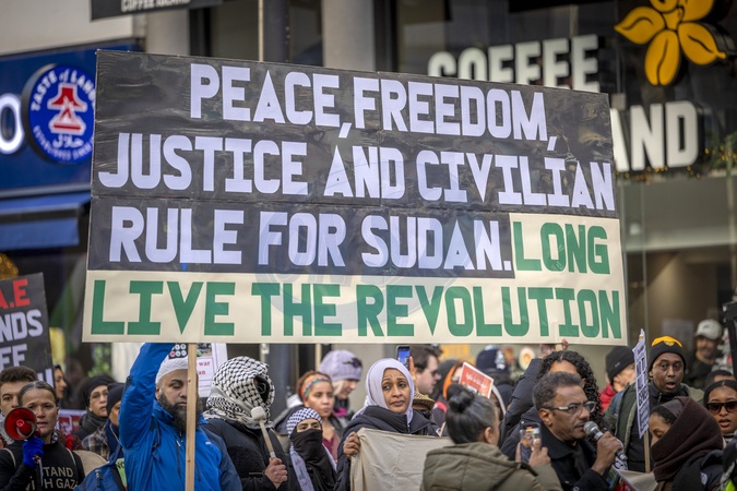 London, UK – On Saturday 20 December 2025, Sudanese communities gathered and marched from Church Street, W2 1EB to Marble Arch to commemorate the 2018 December Revolution. The demonstration honoured the martyrs of the revolution and drew attention to ongoing atrocities, displacement, starvation and alleged war crimes affecting people in Sudan. Protesters reaffirmed their commitment to a Sudan rooted in freedom, peace, justice and civilian rule, declaring that the spirit of the revolution remains alive through collective action and solidarity., Credit:Abdullah Bailey / Avalon