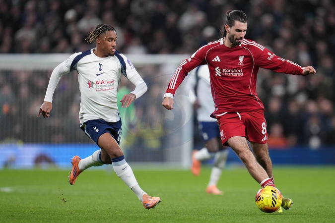 Dominik Szoboszlai of Liverpool tries to play ball under pressure from Wilson Odobert of Tottenham Hotspur during the Premier League match Tottenham Hotspur vs Liverpool at Tottenham Hotspur Stadium, London, United Kingdom, 20th December 2025, Credit:Harvey Murphy/News Images / Avalon