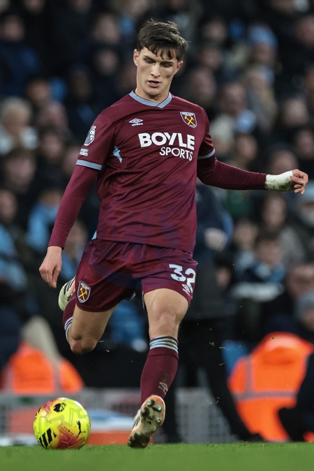 Freddie Potts of West Ham United with the ball during the Premier League match Manchester City vs West Ham United at Etihad Stadium, Manchester, United Kingdom, 20th December 2025, Credit:Mark Cosgrove/News Images / Avalon