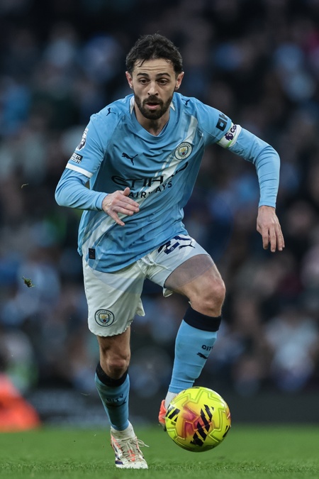 Bernardo Silva of Manchester City breaks with the ball during the Premier League match Manchester City vs West Ham United at Etihad Stadium, Manchester, United Kingdom, 20th December 2025, Credit:Mark Cosgrove/News Images / Avalon