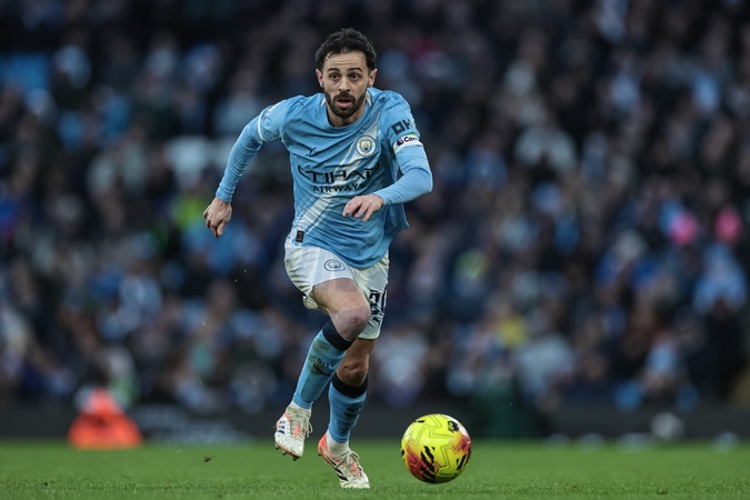 Bernardo Silva of Manchester City breaks with the ball during the Premier League match Manchester City vs West Ham United at Etihad Stadium, Manchester, United Kingdom, 20th December 2025, Credit:Mark Cosgrove/News Images / Avalon
