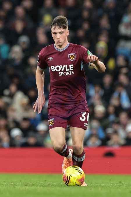 Oliver Scarles of West Ham United breaks with the ball during the Premier League match Manchester City vs West Ham United at Etihad Stadium, Manchester, United Kingdom, 20th December 2025, Credit:Mark Cosgrove/News Images / Avalon