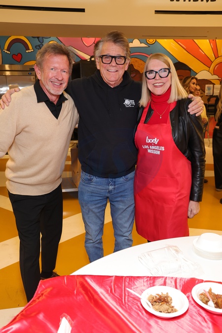 Gregory Mielcarz, Anson Williams and Jackie Gerken take part in the Los Angeles Mission's Annual Thanksgiving Outreach on Skid Row, Los Angeles, USA, 19 December 2025., Credit:Faye Sadou / Avalon