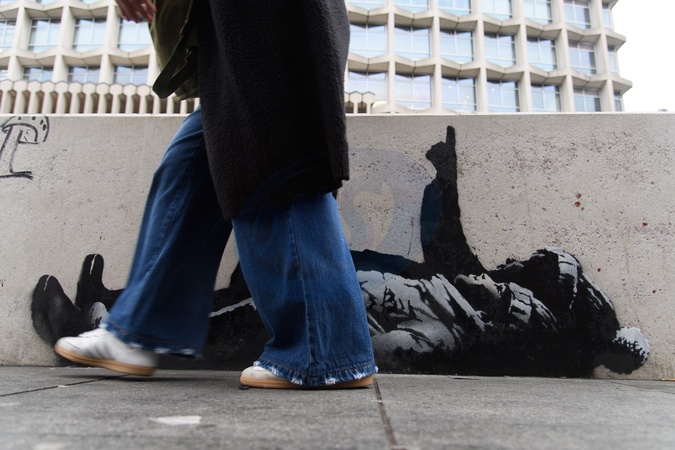 A suspected Banksy artwork depicting children pointing up at the sky has appeared on Tottenham Court Road, London, England, UK on Sunday 21 December, 2025 with the Centre Point skyscraper tower in the background, a potential reference to the skyscraper's history of being an empty skyscraper for the rich that could have housed homeless people and to the homeless charity Centrepoint which was founded in protest at Centre Point., Credit:Justin Ng / Avalon