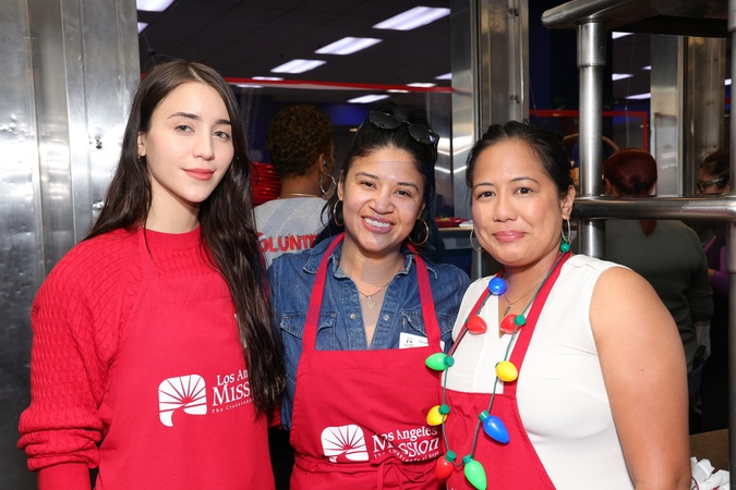 Caylee Cowan, Armida Lopez and Ysabel Jurado take part in the Los Angeles Mission's Annual Thanksgiving Outreach on Skid Row, Los Angeles, USA, 19 December 2025., Credit:Faye Sadou / Avalon