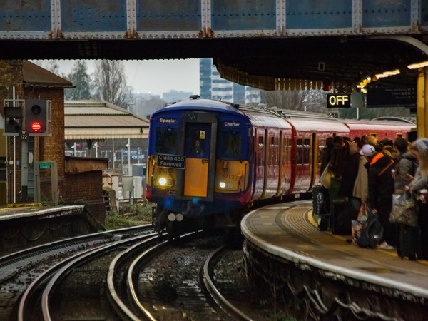 After 42 years, the class 455 farewell tour features south western workhorses that have served London Waterloo commuters till the very end in great reliability. They have won a remarkable total of 13 Golden Spanners awards for reliability to prove it. Built by British Rail Engineering Limited at their workshop in York between 1982 and 1985, the trains entered service on what is now SWR's suburban network on Monday, 28 March 1983. The units on the first train are class 455712+455717, and the second class is 455727+87. The farewell tour by Great British Railways/South Western Railway and the Branch Line Society is raising money for the Alex Wardle Foundation, Macmillan, and Railway Children. With tickers for the tour costing £45.50 having sold out in 15 seconds, London, UK, 21 December 2025, Credit:Alex Day / Avalon