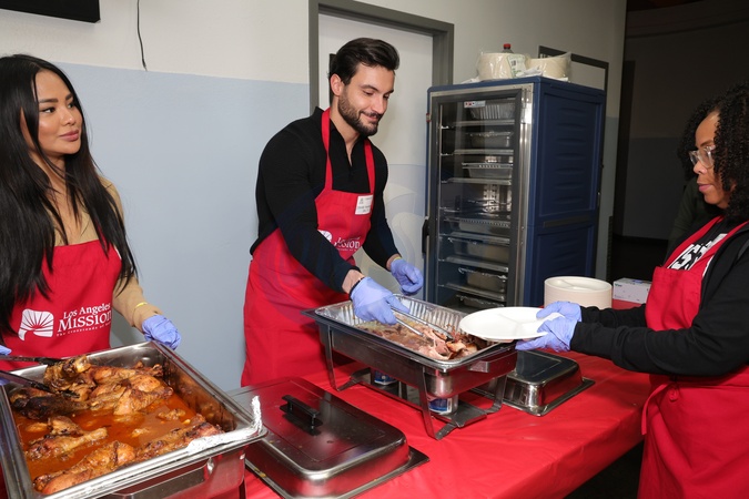 Davide Sanclimenti and Erica McCool take part in the Los Angeles Mission's Annual Thanksgiving Outreach on Skid Row, Los Angeles, USA, 19 December 2025., Credit:Faye Sadou / Avalon