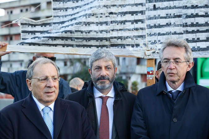 Scampia, northern neighborhood. Demolition has begun on the last red sail, the last of the seven theater sails, marking the end of an era of decay and marginalization for the historic sails. They will be replaced by new sustainable buildings, green spaces, and services as part of the ReStart Scampia urban regeneration project. Pictured: the President of the Campania Region, Hon. Roberto Fico, the Mayor of Naples, Gaetano Manfredi, and the Prefect of Naples, Dr. Michele di Bari. Naples, Italy 17 December 2025, Credit:Fabio Sasso / Avalon