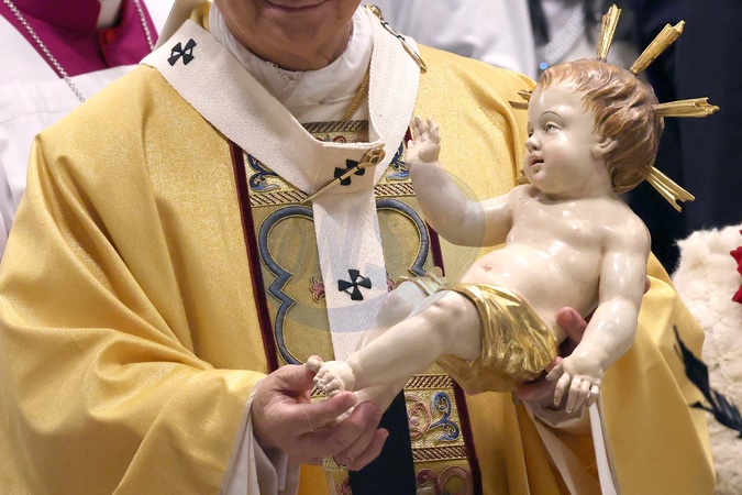 December 24, 2025, Vatican City. Vatican Basilica, Christmas Eve Mass celebration. Pictured is Francis Prevost, Pope Leo XIV with the statue of the Child Jesus., Credit:Maria Laura Antonelli / Avalon