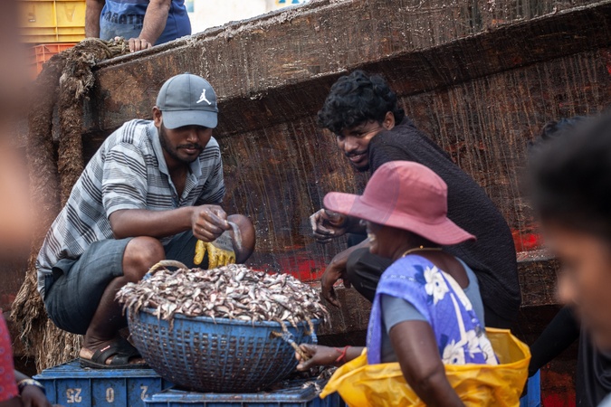 Fishermen and vendors gather during the early morning auction at the Bunder fish market in Mangalore, Karnataka, on December 13, 2025. The bustling riverside market is a primary hub for the Arabian Sea catch, serving as the central point for seafood distribution across South India., Credit:Yousuf Sarfaraz / Avalon