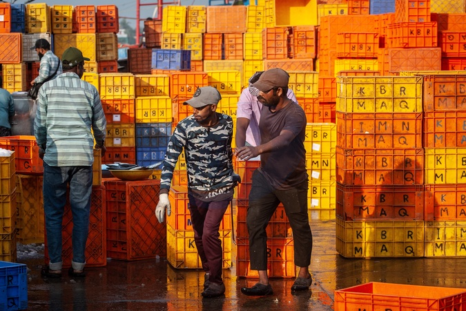 Fishermen and vendors gather during the early morning auction at the Bunder fish market in Mangalore, Karnataka, on December 13, 2025. The bustling riverside market is a primary hub for the Arabian Sea catch, serving as the central point for seafood distribution across South India., Credit:Yousuf Sarfaraz / Avalon