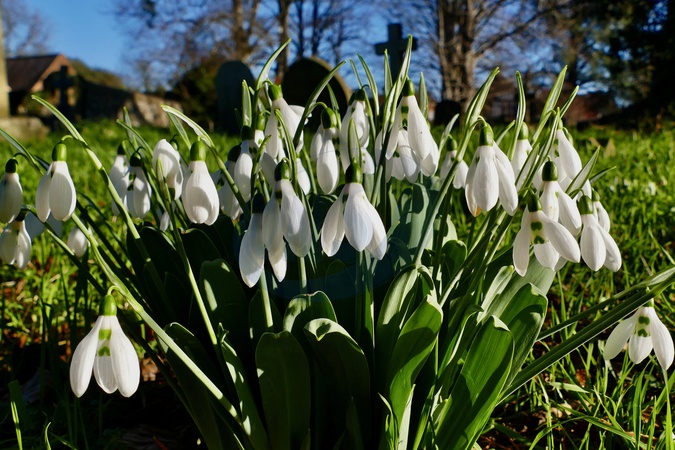 Early snowdrops in bloom in the churchyard in Goring on Thames. Snowdrops typically bloom from January to March, signalling the end of winter and the promise of spring, though they can appear as early as December in warmer years or even in autumn for some varieties, pushing through snow and frozen ground. Their flowering time depends heavily on local climate and specific types, with peak bloom often in February and March, lasting longer in cooler weather., Credit:Geoffrey Swaine / Avalon