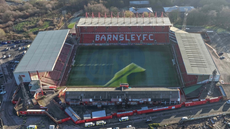 An aerial view of Oakwell on a frosty Boxing Day during the Sky Bet League 1 match Barnsley vs Mansfield Town at Oakwell, Barnsley, United Kingdom, 26th December 2025, Credit:Mark Cosgrove/News Images / Avalon