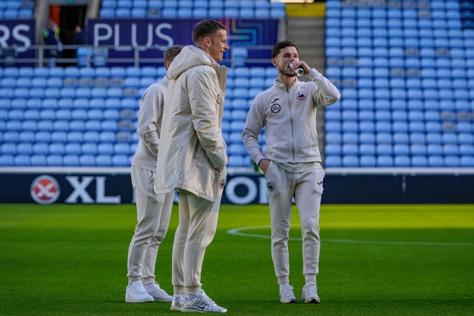 Paul Farman, of Swansea City and Liam Cullen, of Swansea City inspect the pitch during the Sky Bet Championship match Coventry City vs Swansea City at Coventry Building Society Arena, Coventry, United Kingdom, 26th December 2025, Credit:Maynard Manyowa/News Images / Avalon