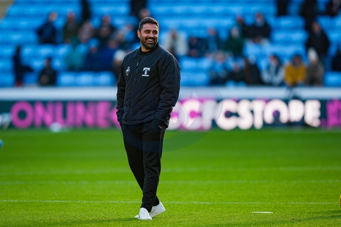 Swansea City Manager Vítor Matos watches his team warm up during the Sky Bet Championship match Coventry City vs Swansea City at Coventry Building Society Arena, Coventry, United Kingdom, 26th December 2025, Credit:Maynard Manyowa/News Images / Avalon