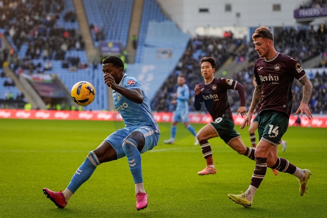 Ellis Simms, of Coventry City fights for the ball with Josh Tymon, of Swansea City during the Sky Bet Championship match Coventry City vs Swansea City at Coventry Building Society Arena, Coventry, United Kingdom, 26th December 2025, Credit:Maynard Manyowa/News Images / Avalon